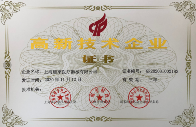 經(jīng)過嚴(yán)格的評定與漫長的等待,上海硅萊醫(yī)療器械有限公司正式通過了“國家高新技術(shù)企業(yè)”認定,自此加入國家高新技術(shù)企業(yè)行列!本次獲得“國家高新技術(shù)企業(yè)”榮譽,將是公司發(fā)展史上又一個值得銘記的里程碑。
