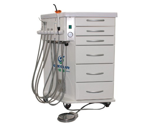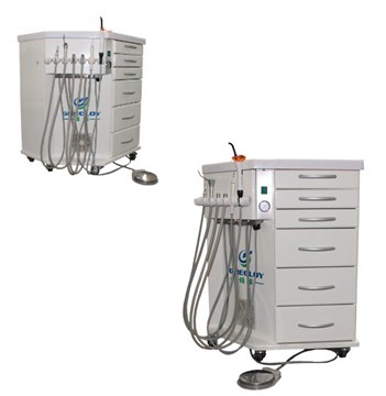 柜式牙科治療機(jī)是集移動(dòng)治療機(jī)、儲(chǔ)物柜、器械盤等功能于一體的室內(nèi)治療單元,它頂部有可取式的托盤桌面,可以方便地取出來(lái)更換或清洗消毒。柜體自帶的抽屜可提供寬敞的儲(chǔ)存空間,方便器械及藥品存放和使用。專用的醫(yī)用腳輪和固定的拉手,可使治療機(jī)在任何地面根據(jù)治療需要而移動(dòng),且能鎖死定位在需要停放的位置。它背面直角的造型使它可以很好的利用墻角空間,能更好的利用診室面積;它內(nèi)置有無(wú)油靜音壓縮機(jī)和儲(chǔ)氣罐,功能俱全。